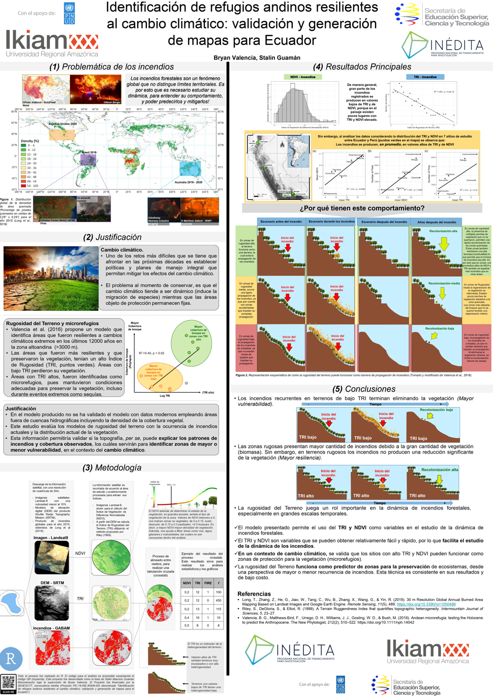 El objetivo principal de este proyecto fue verificar que lugares que tienen una alta heterogeneidad topográfica (Topographic Rougness Index, TRI) tienen mayor resiliencia a incendios. El estudio se realizó en zonas altoandinas de Ecuador y Perú con elevaciones superiores a los 2500 metros. Los resultados muestran que la persistencia de bosques se da en zonas que tienen un alto TRI y que la propagación de los incendios es limitada cuando se tiene alta heterogeneidad topográfica. Los resultados y datos generados por este proyecto y explicados en el video se encuentran aquí: